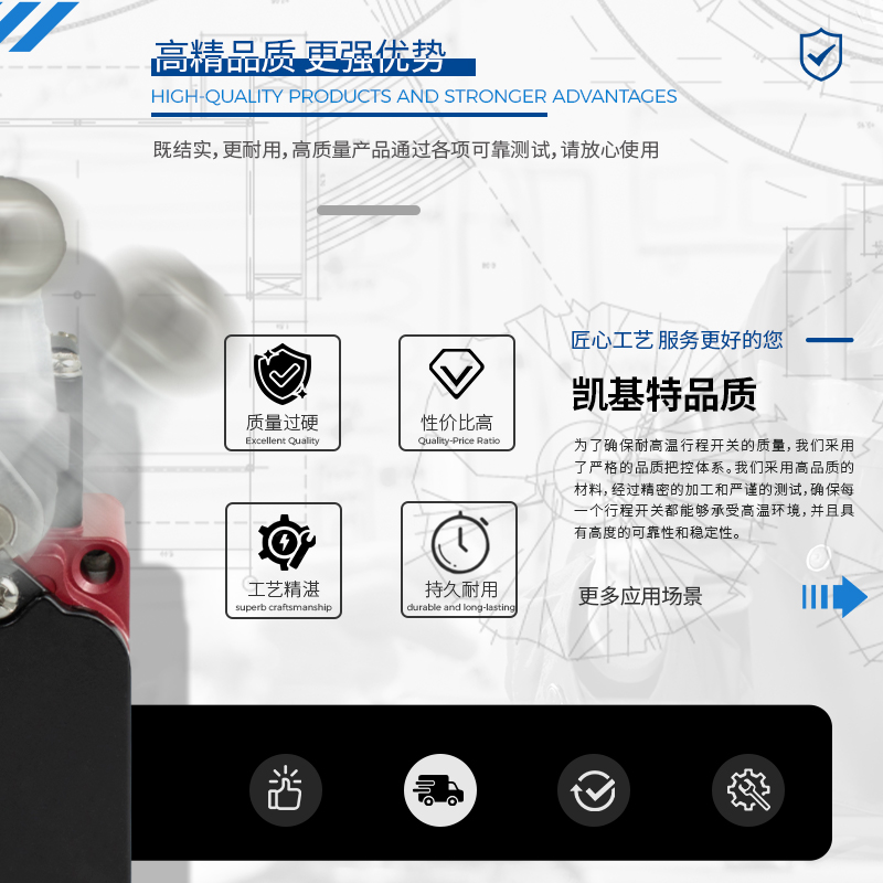 凱基特耐高溫行程開關(guān)具有以下優(yōu)點(diǎn):超位報(bào)警,安全可靠,接觸檢測,磨損小。耐高溫最高可達(dá)550℃。鋁合金外殼 高機(jī)械強(qiáng)度,防護(hù)等級IP67 耐油、防水和防壓結(jié)構(gòu)。