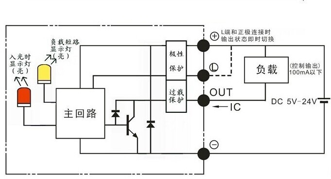 動作模式如光時ON和遮光時ON可通過“L”端與“+”端連接進行切換,運用此功能可以方便構成適合小控制系統;