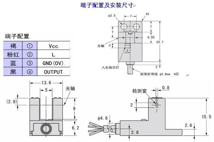 受光時紅色指示燈滅,NPN集電極無輸出;遮光時紅色指示燈亮,NPN集電極開路輸出DC5V--24V 、 100mA以下,殘留電壓0.5V以下(負荷電流100mA時)、殘留電壓0.3V以下(負荷電流40mA時)