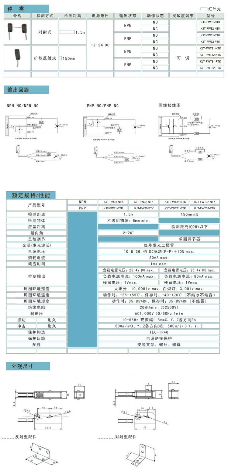 光電開關(guān)是通過把光強(qiáng)度的變化轉(zhuǎn)換成電信號(hào)的變化來實(shí)現(xiàn)控制的。凱基特光電開關(guān)產(chǎn)品種類齊全,漫反射式,鏡反射式,對(duì)射式,圓柱形,方形,槽型,繼電器輸出等。凱基特標(biāo)準(zhǔn)型光電開關(guān)產(chǎn)品種類齊全,漫反射式,鏡反射式,對(duì)射式,遠(yuǎn)距離型,智能型,繼電器輸出型,抗干擾性強(qiáng),性能穩(wěn)定,全面滿足您需求。